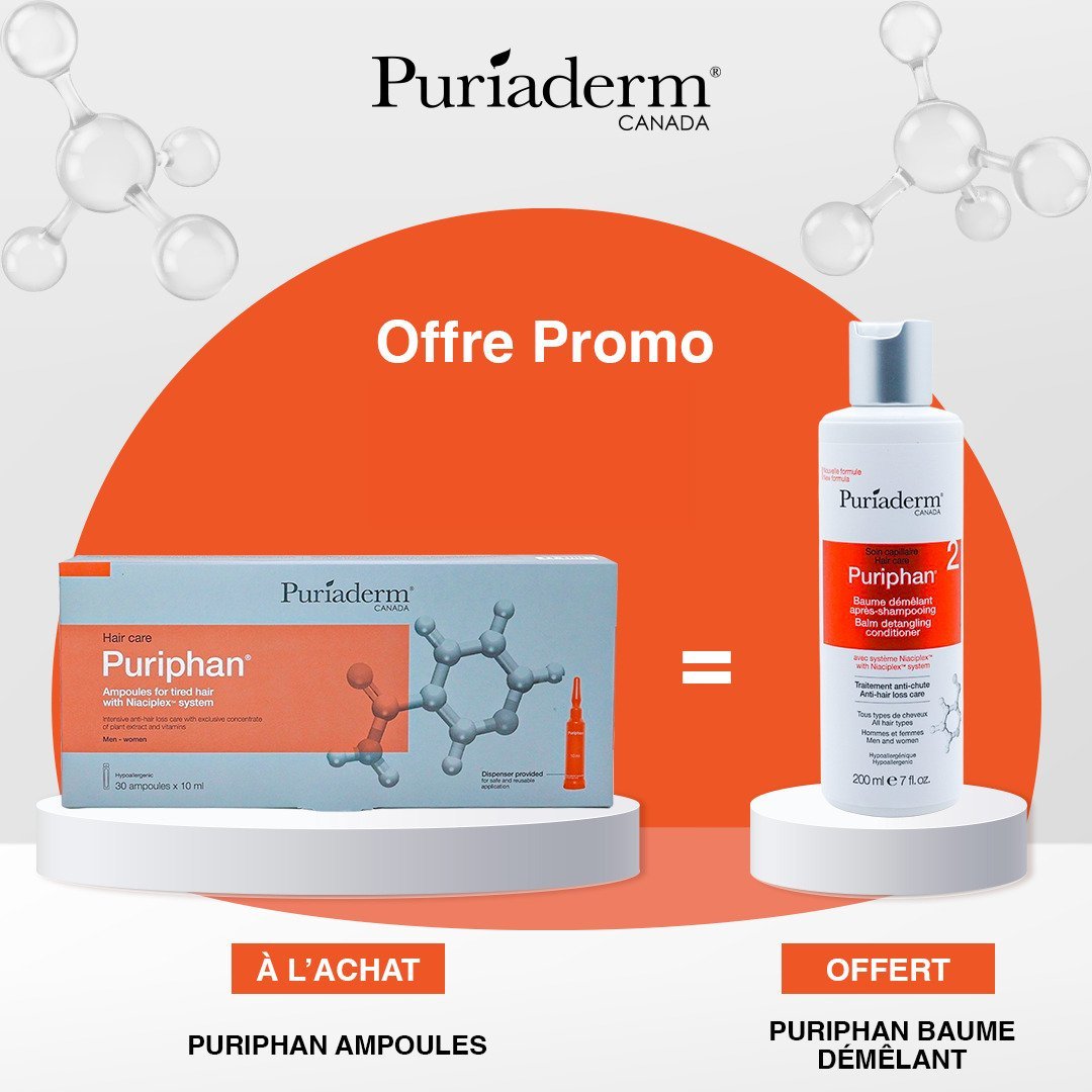 Dites stop à la chute de cheveux avec la gamme Puriphan : Ampoules, Shampooing Energisant et Baume Hydratant.