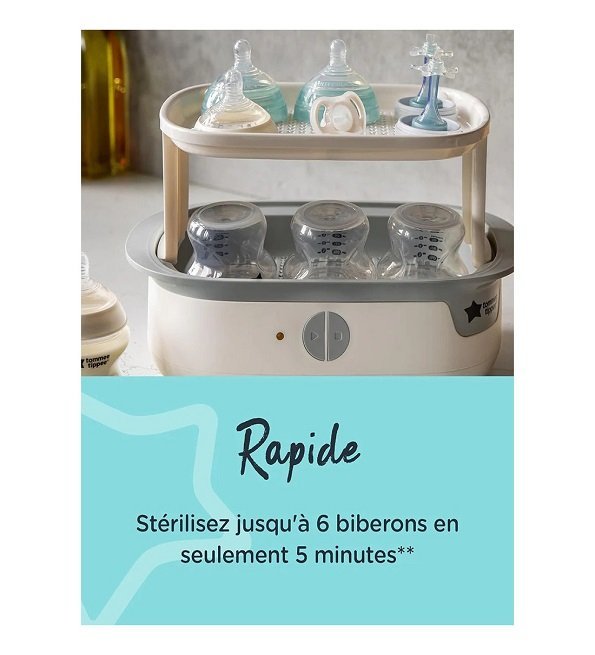 Ce stérilisateur à vapeur est particulièrement adapté aux produits Tommee Tippee, mais convient aussi aux biberons, sucettes, tire-lait et accessoires d'autres marques.