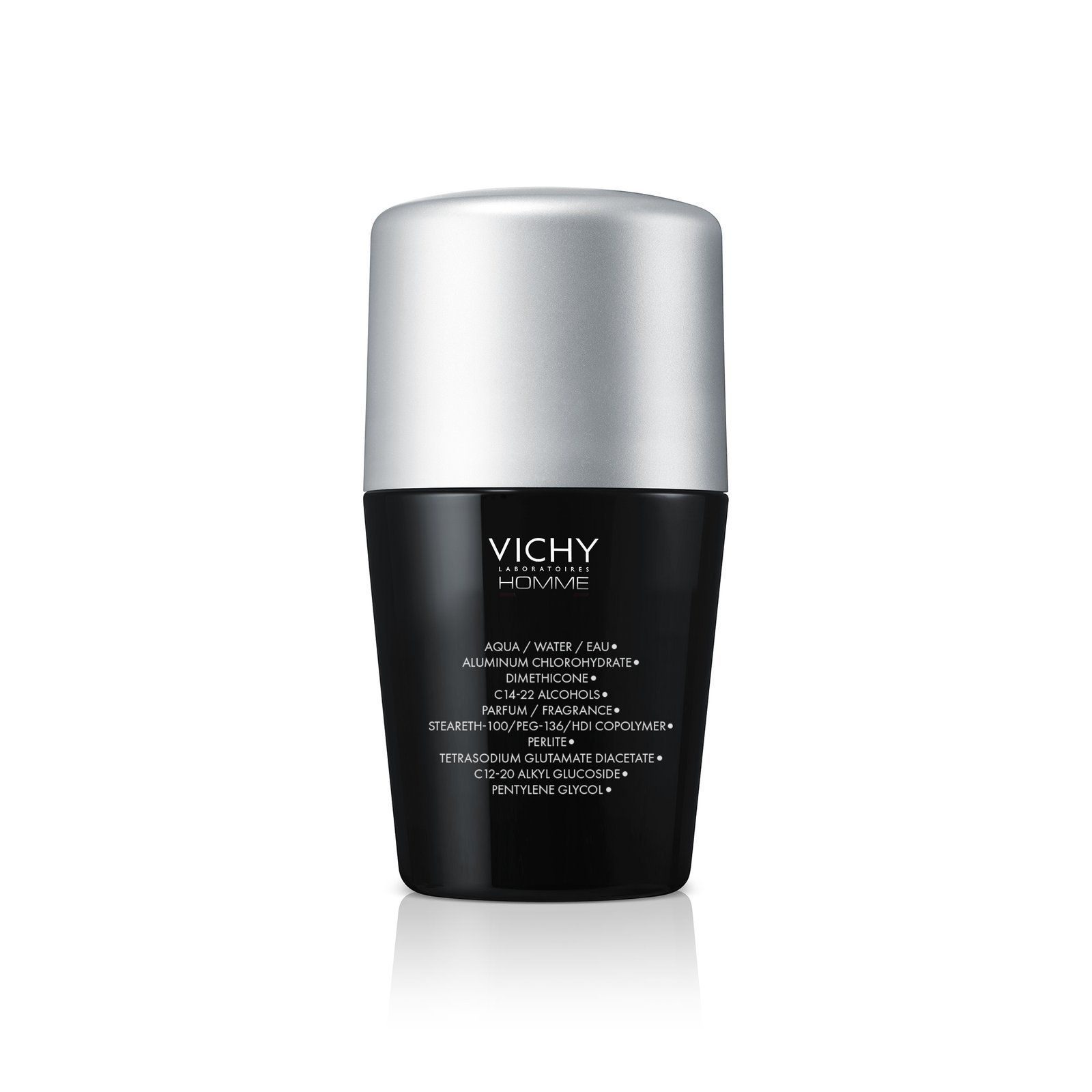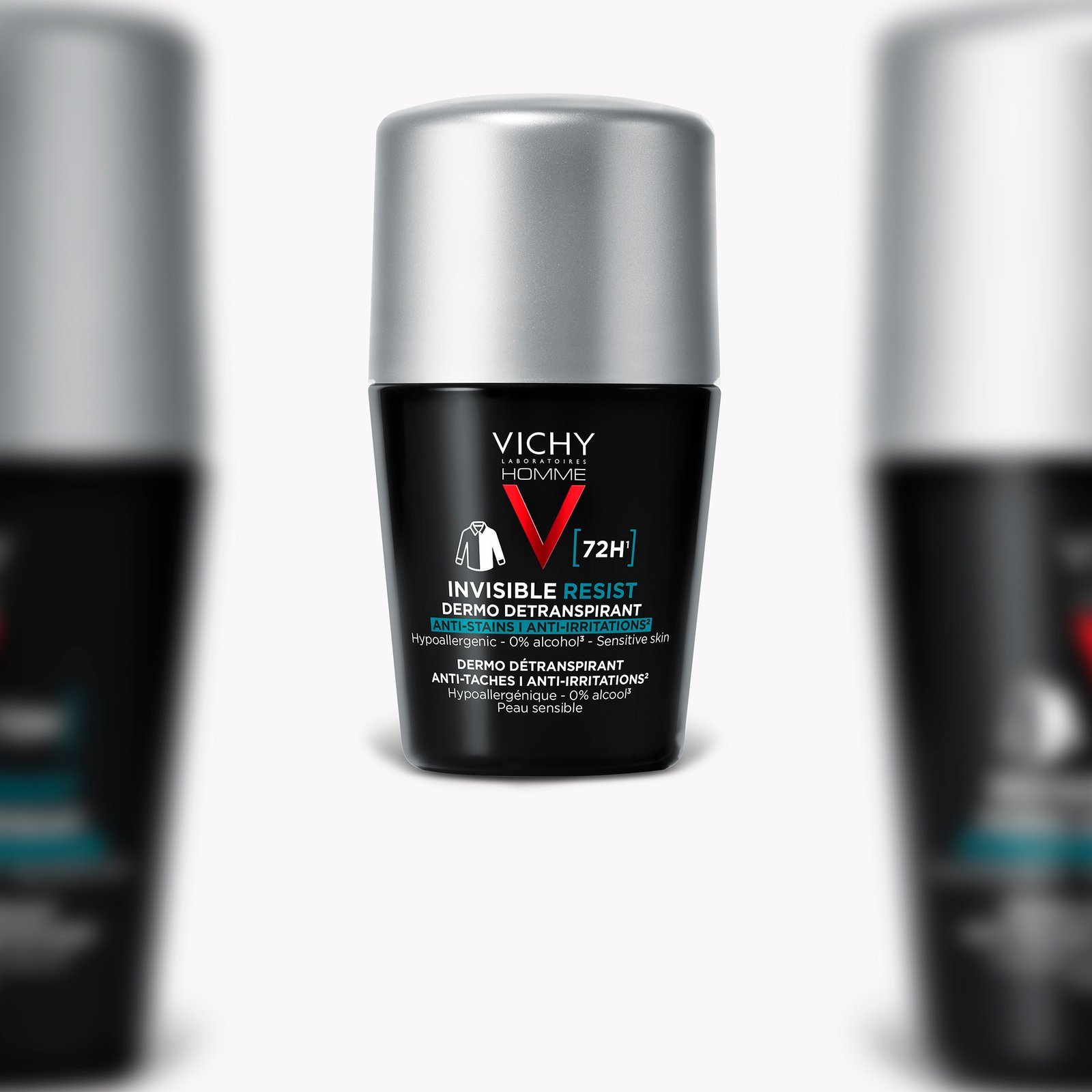 Le dermo-détranspirant Vichy Homme Invisible Resist 72h, formulé spécialement pour les hommes, associe efficacité grâce à son action anti-humidité et anti-odeur et une tolérance optimale avec sa formule sans alcool hypoallergénique testée sur peau sensible pour une action anti-irritations. Sa technologie Invisi-Lock approuvée par l’IFTH (Institut Français du Textile et de l’Habillement) prévient l'apparition de traces jaunes sur les textiles clairs, blanches sur les textiles foncés et des résidus qui peuvent les rigidifier. Les bénéfices de sa technologique de pointe unique est cliniquement prouvée est approuvée par 90% des utilisateurs qui le juge efficace contre les mauvaises odeurs.